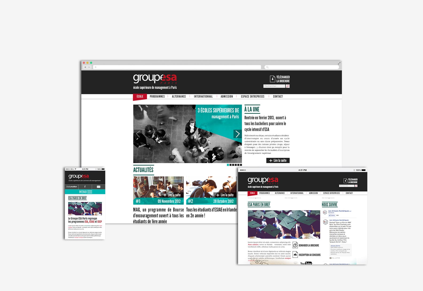 Réalisation du design en responsive (desktop /tablette / mobile) du siteweb de l'école ESA PARIS. Site réalisé par les Artisans Numérique.
